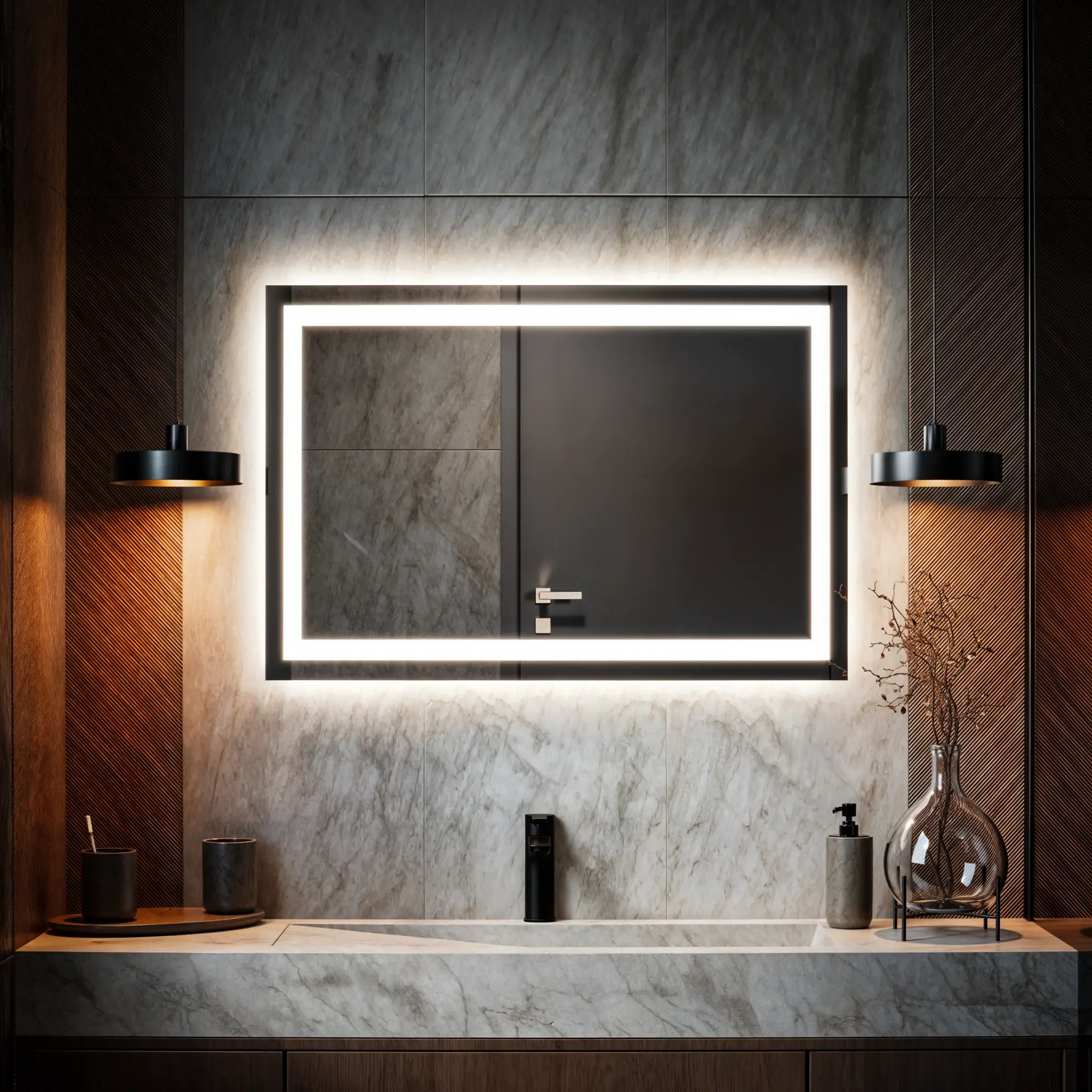 Kwadratowe Lustro LED z wyborem podświetlenia i nowoczesnymi funkcjami.