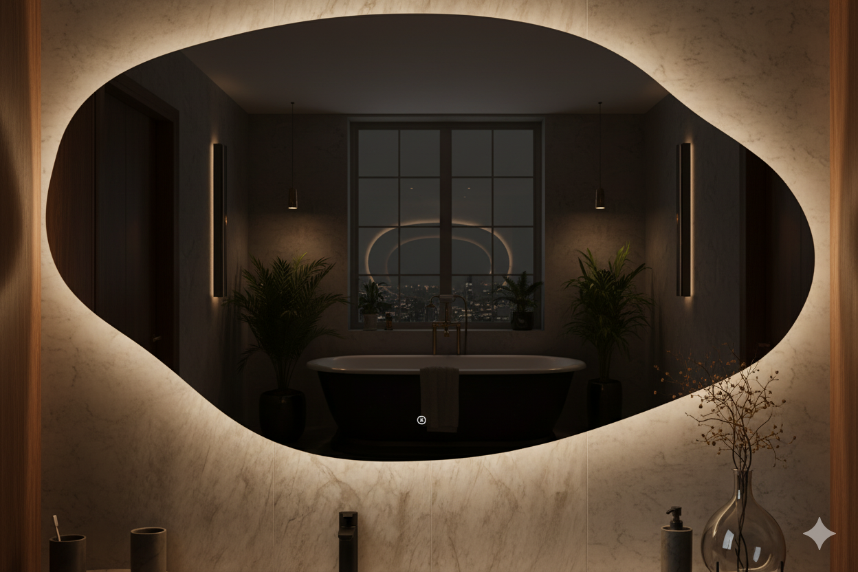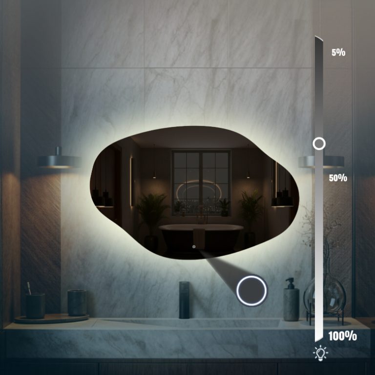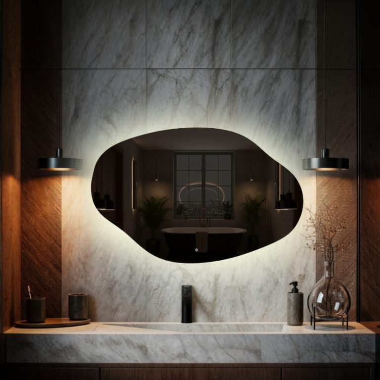Nieregularne Lustro LED z wyborem podświetlenia i nowoczesnymi funkcjami.