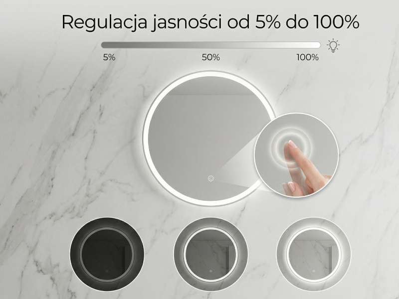 Dostosuj oświetlenie do każdej chwili. Nasze lustra LED oferują płynną regulację jasności w zakresie od 5% do 100%, dzięki czemu z łatwością stworzysz idealną atmosferę – od delikatnego, nastrojowego światła po pełne, funkcjonalne oświetlenie. Wszystko dla Twojej wygody i komfortu użytkowania.