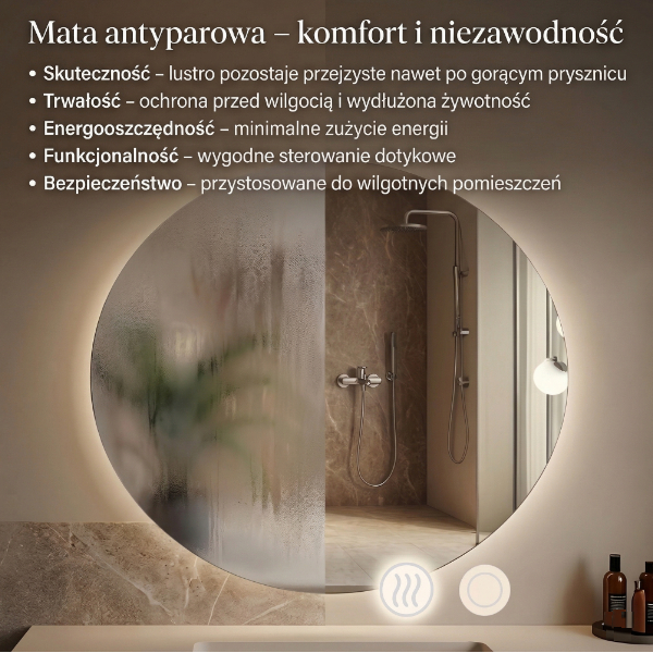 Skuteczność – wbudowana mata grzewcza zapobiega zaparowaniu tafli, dzięki czemu lustro pozostaje przejrzyste nawet po gorącej kąpieli czy prysznicu.
